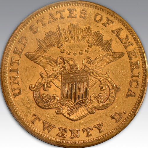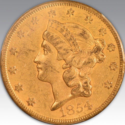 Early $20 Lib…very rare variety!!!! After the 1849 Gold Rush, the Mint started maintain $20 gold pieces as a way to use the great influx of gold from the West Coast. The big gold coins were immediately very popular domestically, and especially in international trade. The $20 face value was a big amount of money at the time, so collectors were initially few and far between. That would soon change, and there have been many serious collectors of this series in the past 100 years. The rarities have responded with appropriate price levels. The early, pre-Civil War, issues are by Far rarer than the later issues. The 1854 is tough to find in high grades. There are two varieties of the 1854 $20 Liberty….one with a “large date”, and one with a definitely “small date”. In 38 years, PCGS has graded a total of 885 small dates, but just 117 large dates. Either one is an important early issue. There are very few actual Mint State 1854 twenties known. The auction record for this issue is $96,600 for a MS64 in September, 2008!!!! This specimen is very close to Mint State. It Has totally original color and luster, and few marks. Any collector of this series would be delighted with this specimen of these early rarity…$15,750